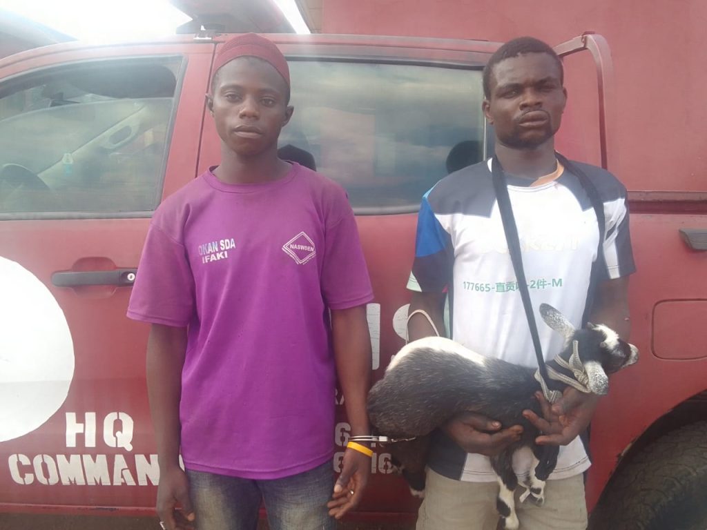 The duo were arrested on Wednesday 18th March, 2026 by the Amotekun Operatives at ldo-Osi Local Government Area Command, for their alleged involvement in the stealing of a goat, belonging to Mr. Dada Aseju who resides in the same town with the first suspect, Oluwasegun Ayomide lge